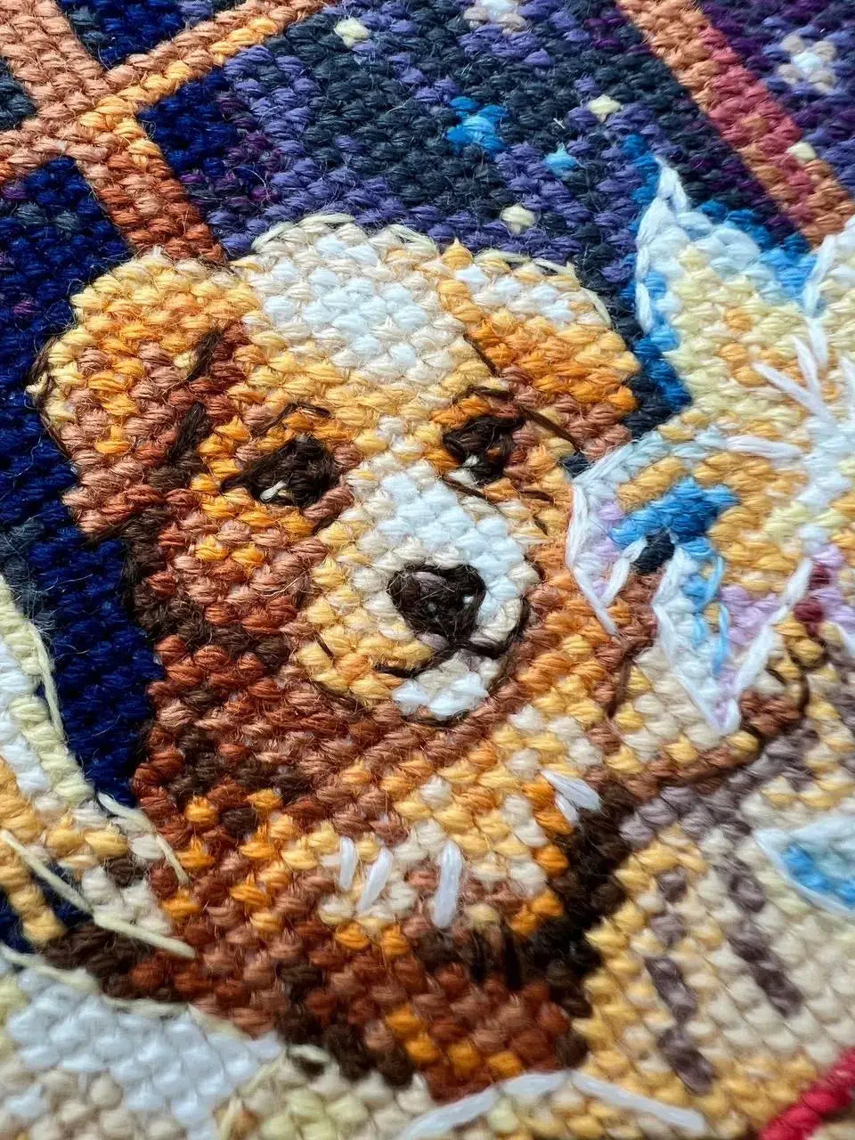 Broderes i utregnede korssting 5.4 ruter / cm med "Anchor" moulinegarn på Aidavev 14 ct.