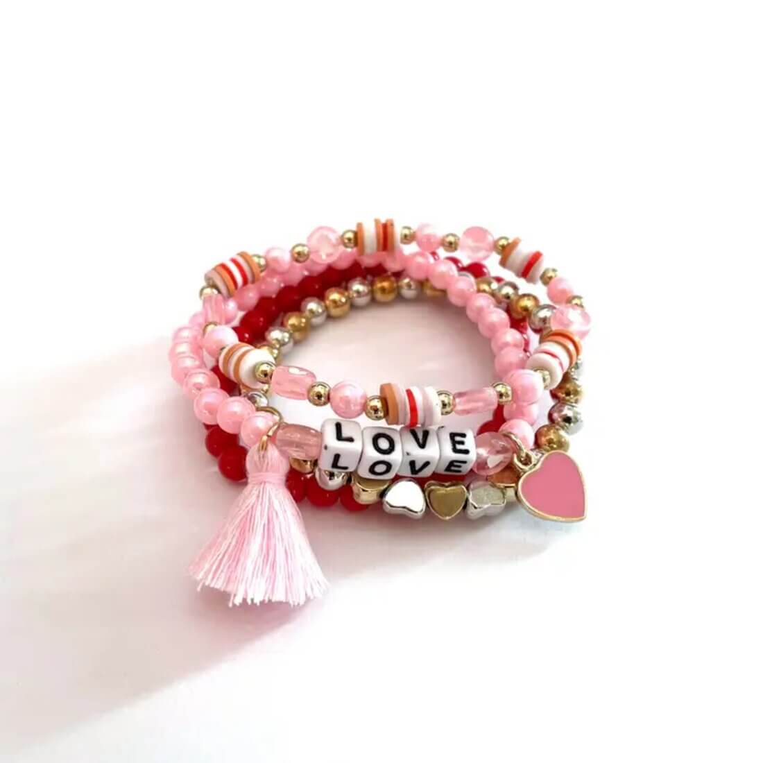 Et søtt og personlig perlesett fylt med lyserosa perler og alfabetperler + bonus charms – alt pakket i en dekorativ glasskrukke.