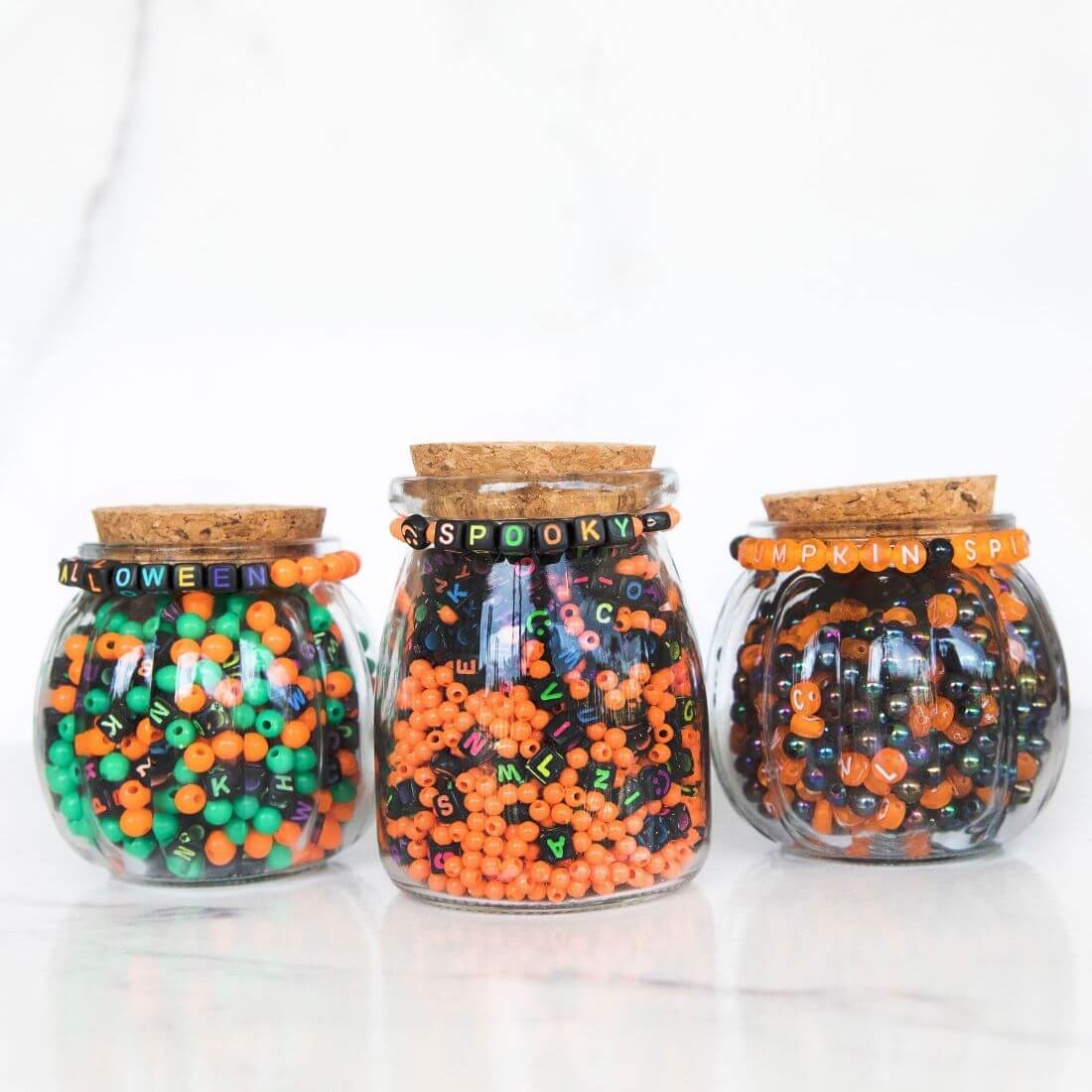 Et stemningsfullt Halloween perlesett med oransje og svarte perler, kombinert med alfabetperler – perfekt for å lage skumle (men søte!) smykker.