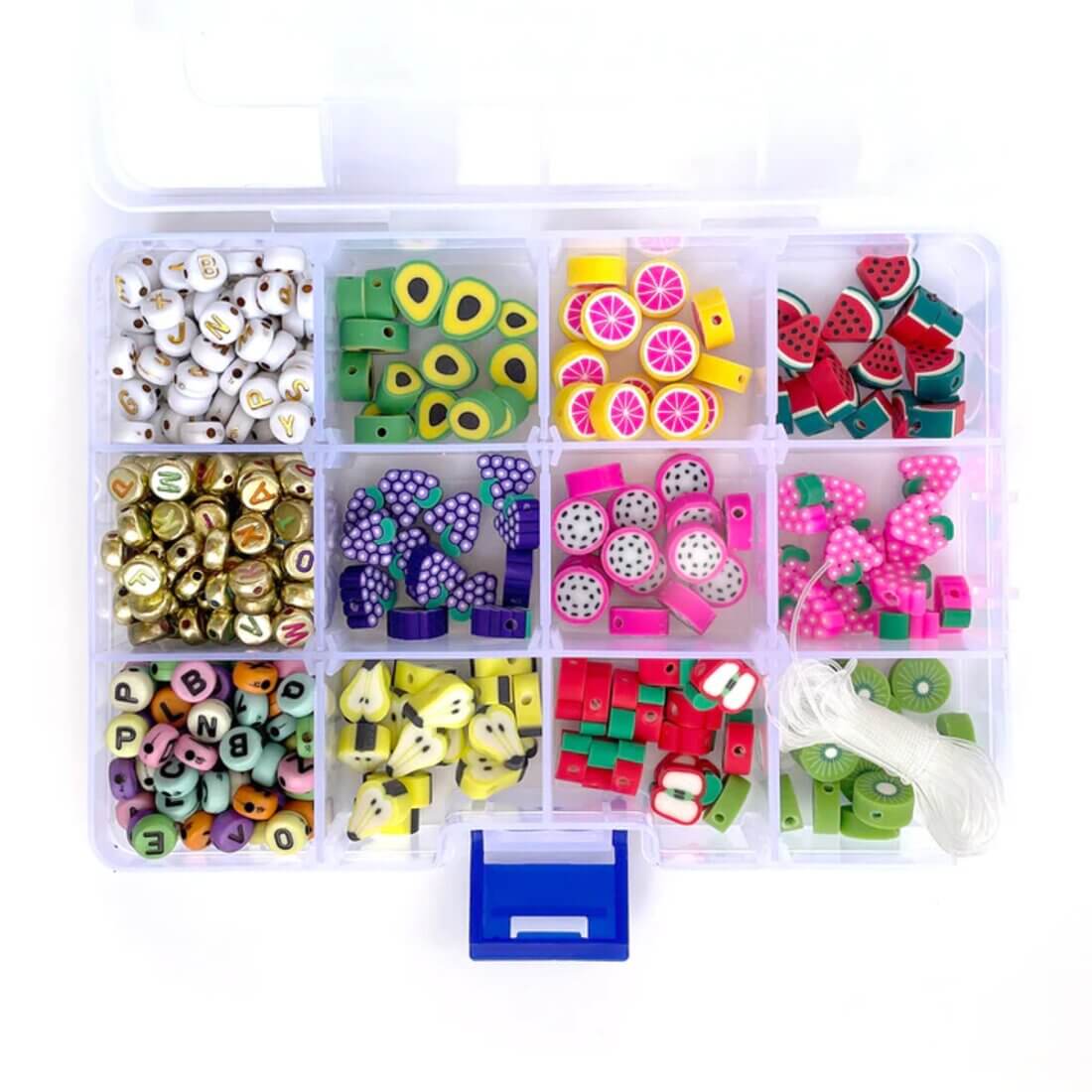 Settet inneholder: organizer eske med perler formet som frukter, alfabet perler og elastisk snor.