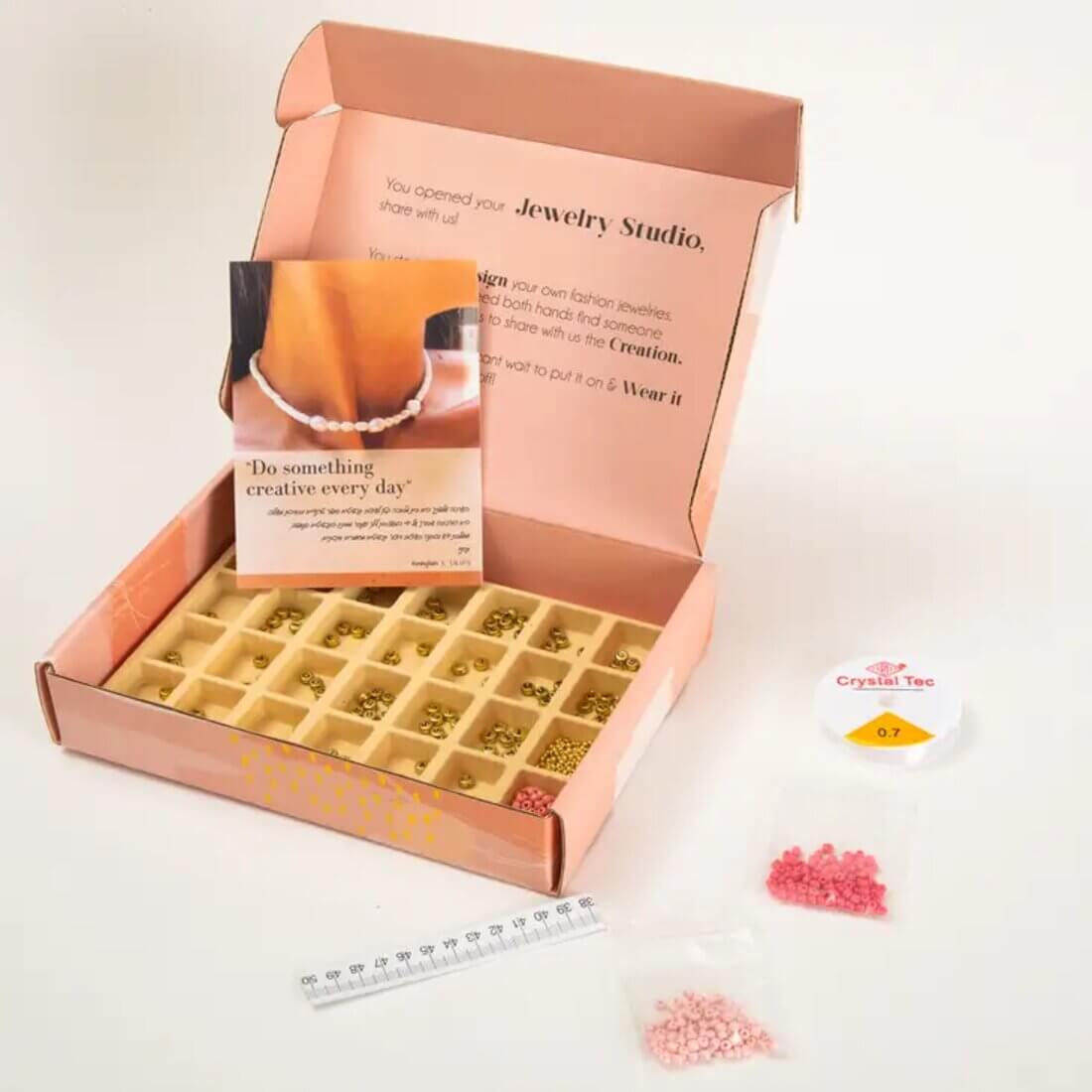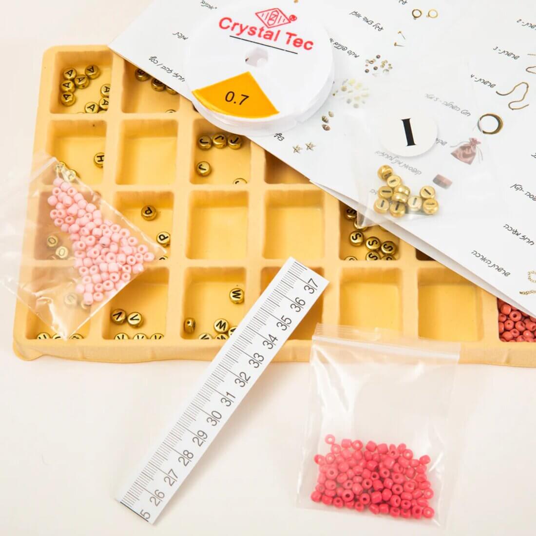 Dette er et høykvalitets DIY smykkesett med bokstavperler i gull farge og 500 + perler i forskjellige lyserosa farger.
