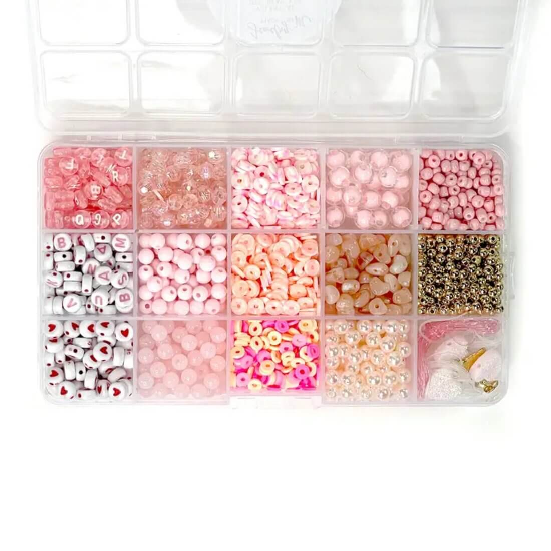 Dette perlesettet kommer i en fin og ryddig organizer fylt med perler i delikate rosatoner, små charms og elastisk snor. Perfekt for alle som elsker DIY.