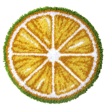 Ryematte sett inneholder: mønster, påtegnet strameistoff, ferdigklippet akrylgarn, ryekrok og instruksjoner.